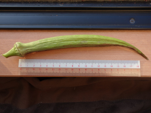 種をとるために育てている大きな1本より上に生っていた1本。曲がっています。養分が下の1本にとられているからかもしれません。