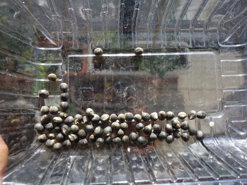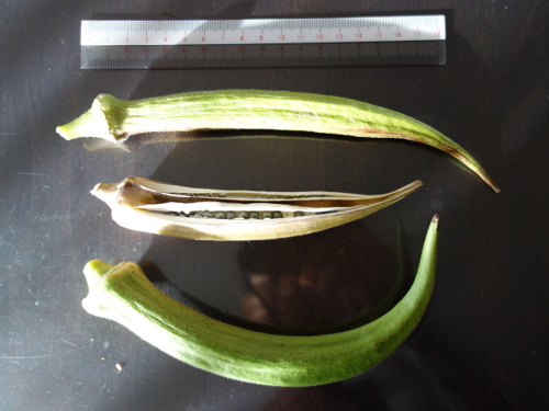 オクラの種を取り出しました。黒くていい感じの種ができていました。沖縄赤オクラの種とそっくりですが、色は沖縄赤オクラの方が若干濃いです。これは実の熟成度の違いだと思います。沖縄赤オクラの方はサヤが割れるまで生らせていました。