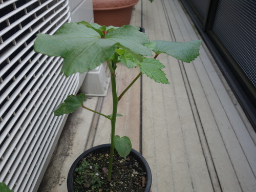 オクラの苗3本目(No.3とします)はフェイジョアを植えてある鉢の脇に移植しました。