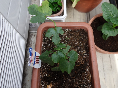 すでに植えてあるのは2017年4月28日にDCMダイキ ペット&グリーンから買ってきた普通のオクラの苗です。