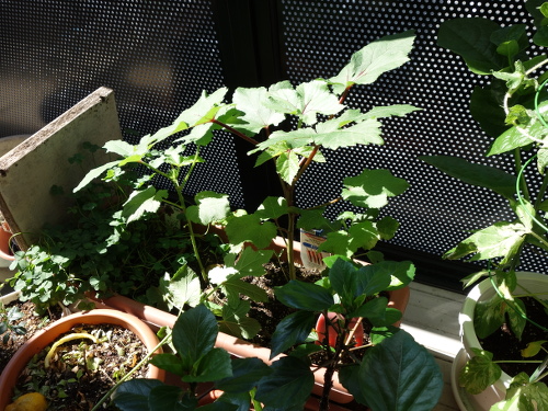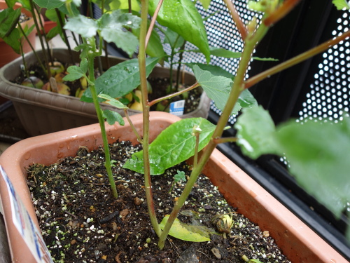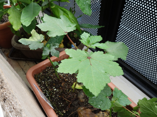レッドサンがグングン生長しています。右は同じ日に買ってきた普通のオクラ。左端は以前から植えている生長しないオクラの苗。