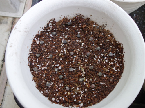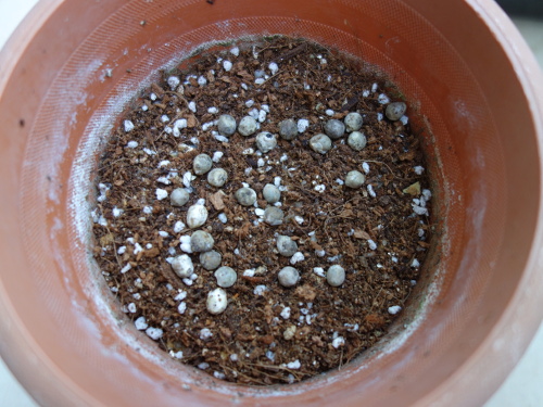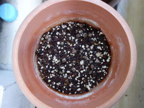オクラの種を鉢の中の土の上に蒔きました。土は「タキイのタネ」の「野菜と花の培養土」。水をたっぷりかけました。