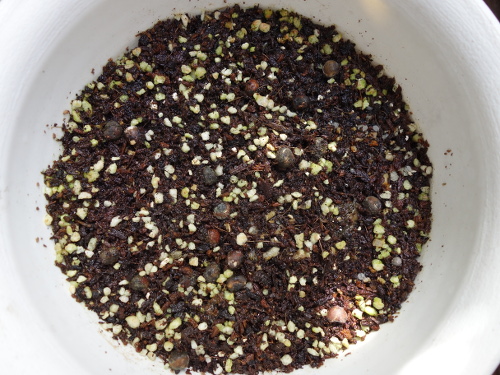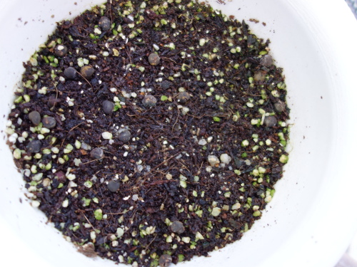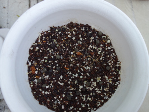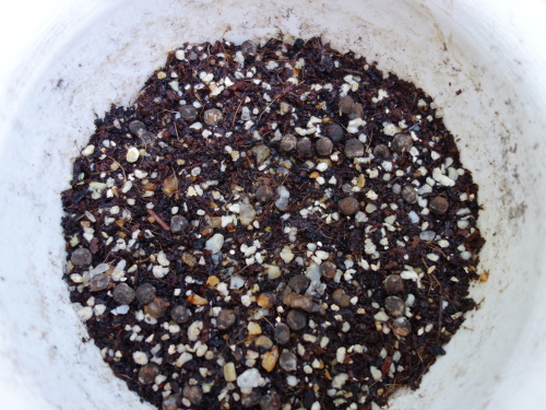 沖縄赤オクラの種を鉢の中の「タキイのタネ」の「野菜と花の培養土」に蒔いて、水をたっぷりかけました。