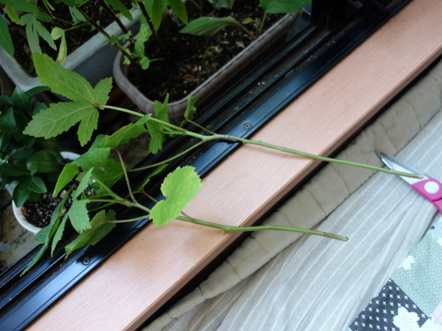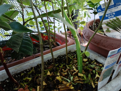 などが考えられます。最初4本あった赤オクラの苗も以前1本間引いて、残った3本から今回2本間引きました。これで最後の1本になったわけですが、これが今の3倍ぐらいの速度で生長してくれることを期待します。それでも今ひとつの場合は、ツルムラサキ(緑茎種)の影響が大きすぎるものと考えられます。その時はツルムラサキを処分するなり対策を考えます。
