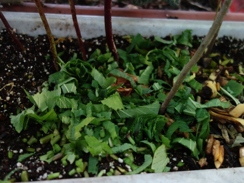 間引いた2本はキッチンバサミで刻んで、プランターの中に置きます。循環してもらいます。