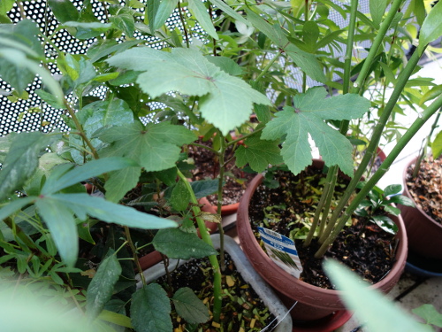 赤オクラは今後はこの1本に絞って栽培することにしました。右側の鉢の島オクラの苗4本はかなり育っています。この差はどこからくるのでしょう。赤オクラはすぐ近くのツルムラサキ(緑茎種)に養分を取られているのかもしれません。