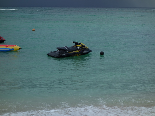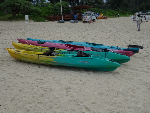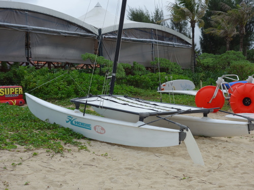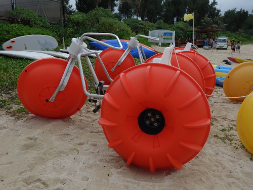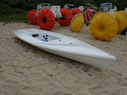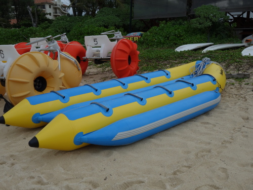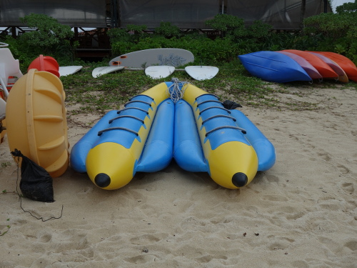 ザ・ブセナテラスのシーサイドカウンター近くの浜辺にはマリンアクティビティのワンショットアイテムがたくさん置いてありました。いろいろあって、名前が確認できていない(よくわからない)ものもあります。