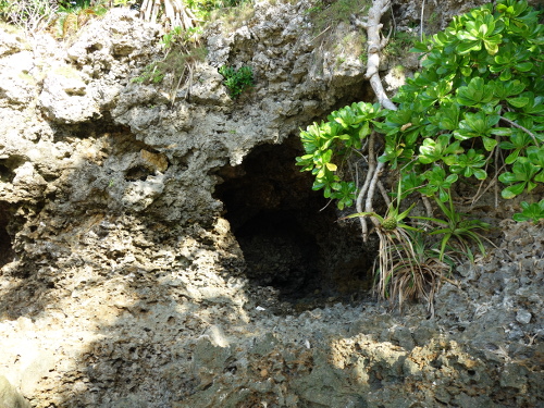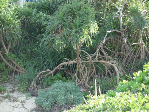 14:23撮影。御菓子御殿恩納店の裏の海から上に上がる時に撮ったタコノキ。その時のタコの実はこちら→飛んだ先のページの最後の写真は落ちたタコの実のに集まってきたヤドカリ