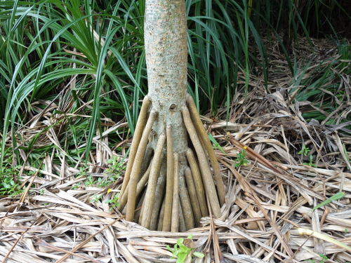 アダンの実はタコノキの実(タコの実)とよく似ています。私が御菓子御殿恩納店の店の裏の浜辺に降りて行く時にアダンだと思っていた木は、生っていた実がアダンの実に見えたのですが、タコノキだったようです。その木の根元(上の写真の最後から2枚目)から判断するとタコノキなので、そこに生っていたアダンの実と思っていた実はタコの実ということになります。その実が木の真下にバラバラに落ちていて、ヤドカリがたくさん寄ってきていたのは、実が食べられるからなのでしょう。アダンの実もタコの実も食べても美味しくないそうです。石垣島のスナックパインは手でちぎって食べられて、しかも美味しいですが、アダンの実もタコの実も同じような果実なのに美味しくないようです。おもしろいですね。