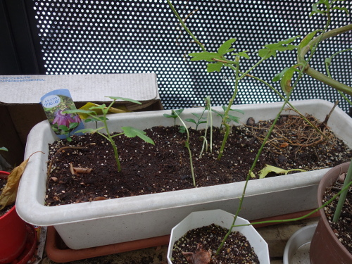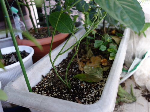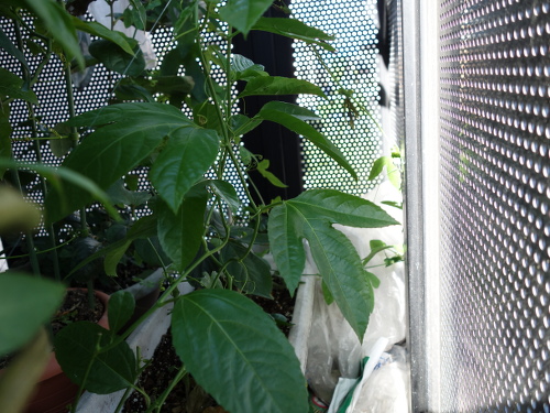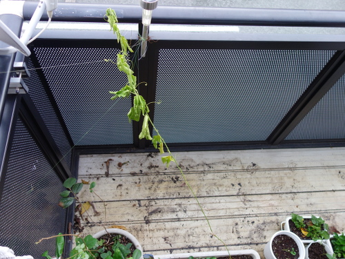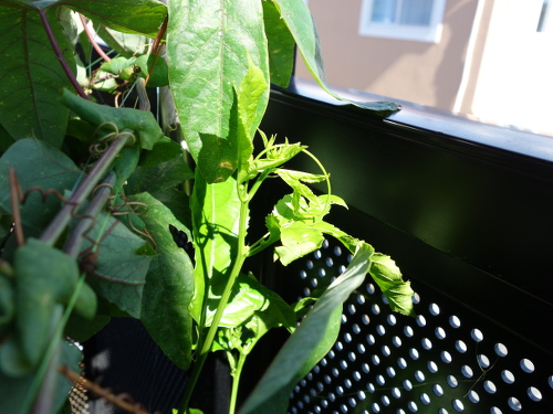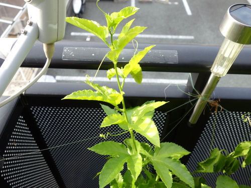 植えてから1ヶ月ちょっとで、ツルの先端がやっとベランダの手摺りのところに届きつつあります。急に生長し始めた感じです。日中は手摺りが高温になっているので、先端が接触して焼けてしまわないように、別の方向に誘導しなければなりません。