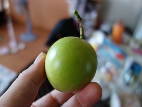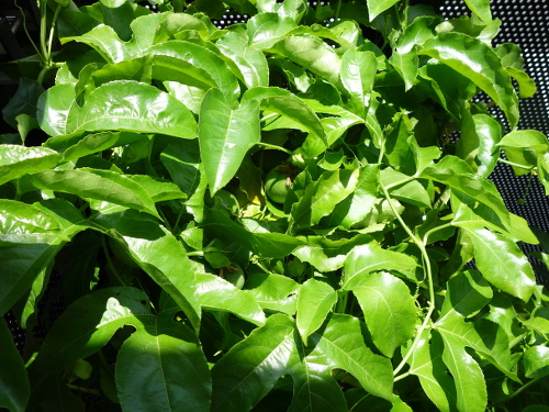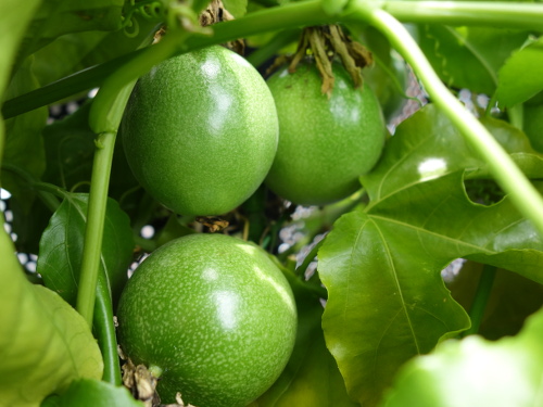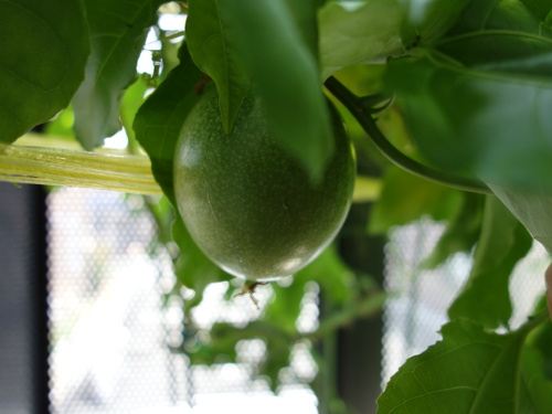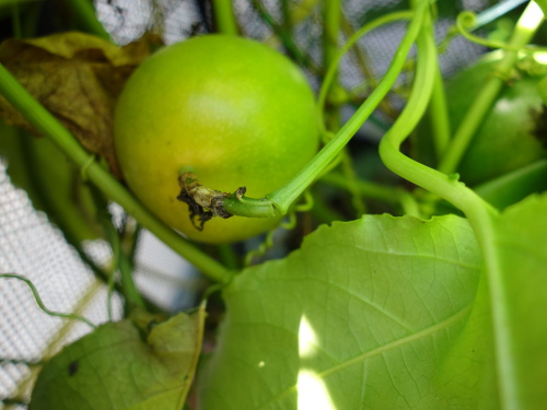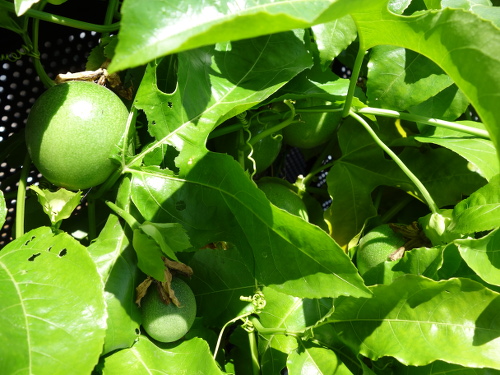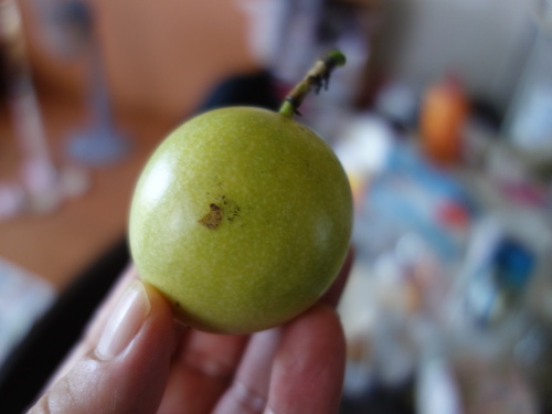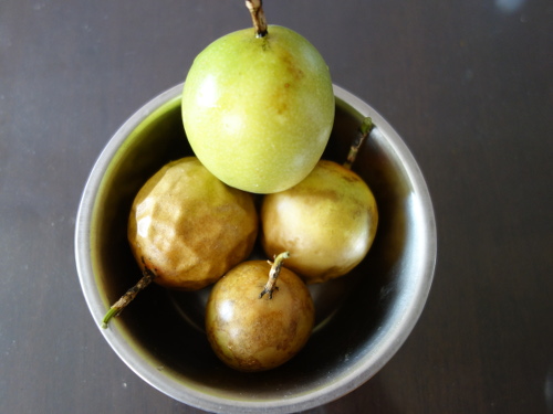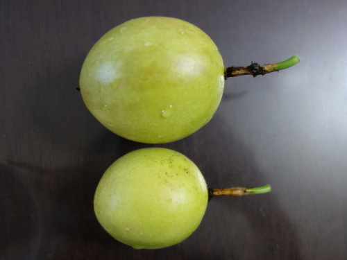 今回の収穫分は紫色になっていませんが、物産館で見かける市販のパッションフルーツは、紫色のほかに黄色いものもありますので、もともと黄色い品種であった可能性もありますが、エドゥリスのように紫色になる品種でも黄色いうちに落果することもあることがわかります。仮に紫色と黄色を並べてあっても、とても同じ木から収穫した果実だとは思えないですね。2016年7月18日に黄色い果実を収穫したことがありますが、味は紫色になった果実と遜色なかったという記憶があります。また、3週間ほど熟成したら腐りかけの味がして美味しくなかったので、今回は1週間から10日ほどで食べようと思います。