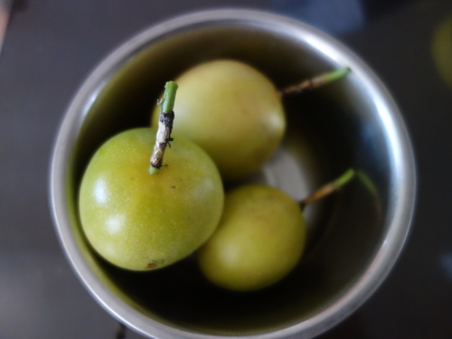 これが今日収穫した3個。上から時計回りにA, B, Cです。A, Bの2個は早朝に落ちていた果実。いちばん上の果実はCで、落ちかけているのを自分で収穫した分。大きさの順番はA>C>Bです。
