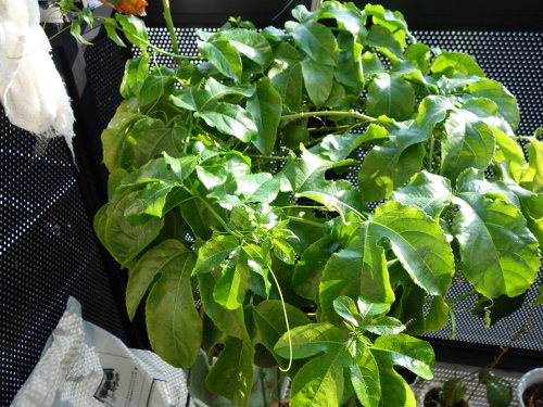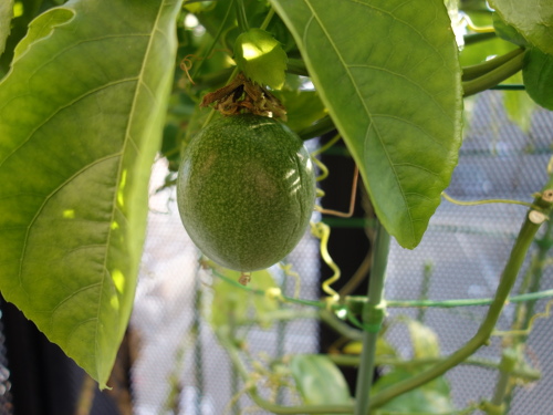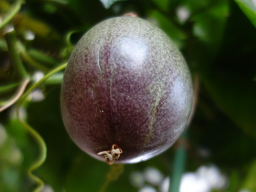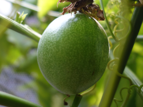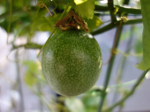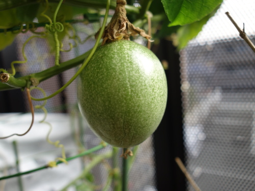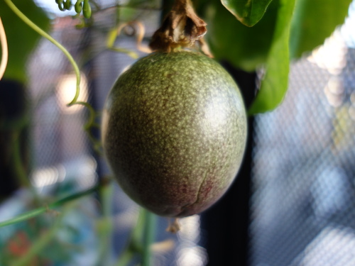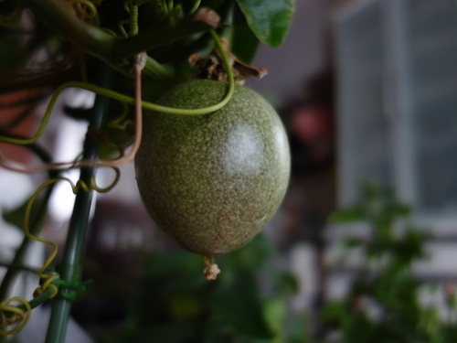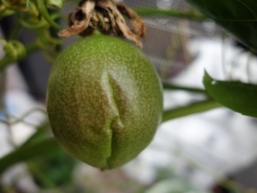 2017年10月27日のパッションフルーツの花が結実して2018年3月2日現在で4ヶ月になります。冬越えは室内(リビング)で行いましたが、ほぼ成長が止まったままこんなに長期にわたって落果しませんでした。現在、頂部が紫色になってきて落果も近いと思います。