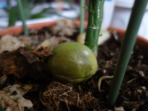 2018年1月18日現在、秋に花が咲いてから3ヶ月以上経過しましたが、まだ実が落ちずに生っています。室内で越冬した形ですが、これは今後どうなるのでしょうか。結末を見届けたいと思います。