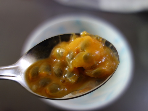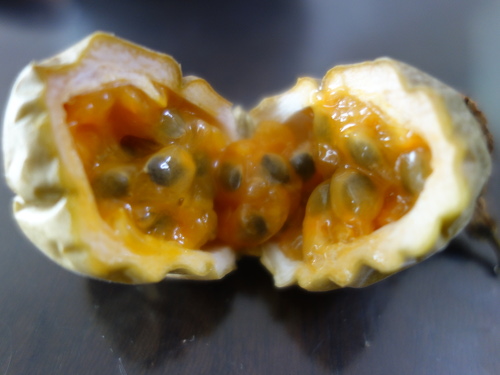 スプーンで掬ってみました。見た目には普通のパッションフルーツという感じです。食べてみたらいい香りがして酸味もありました。甘味が少し足りない感じです。でも、食べられないことはありません。冬場でもまあ何とか食べられるものが収穫できることがわかりました。