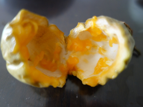 2018年2月26日現在、落ちてから半月経った果実を食べてみました。見た目には美味しそうな黄色の果肉でしたが、食べてみると酸味はあって甘味が不足している感じでした。でも食べられないことはありません。この結果から、冬場でもまあ何とか食べられるものが収穫できることがわかりました。まだ2個目が残っています。再現性を見てみます。種も採れたので、蒔いてみることにします。今回の果実は種から発芽してから1年半後の収穫になりました。花が咲いたのが秋で、寒さに向かっている日々だったからこのような4ヶ月と言う長期になりましたが、時期が寒い時期にずれなければ基本的に1年で発芽から収穫まで到達できると思います。