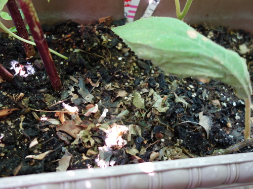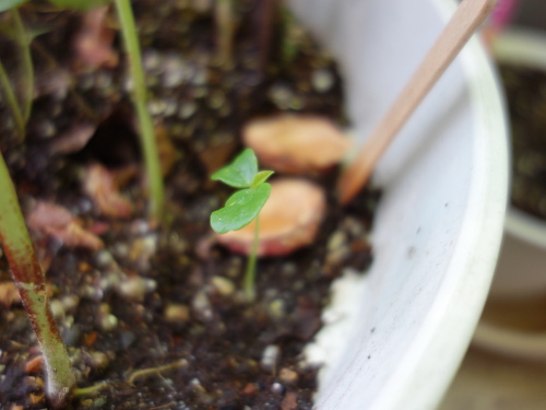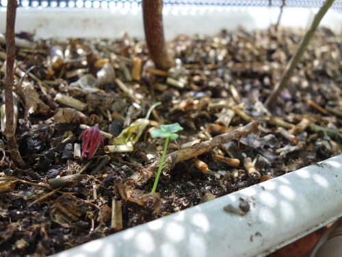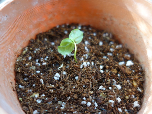 昨年2015年に蒔いた種から1本発芽しているのを見つけました。昨年蒔いた時には発芽しなかった種です。第一世代になります。このまま育てることにします。