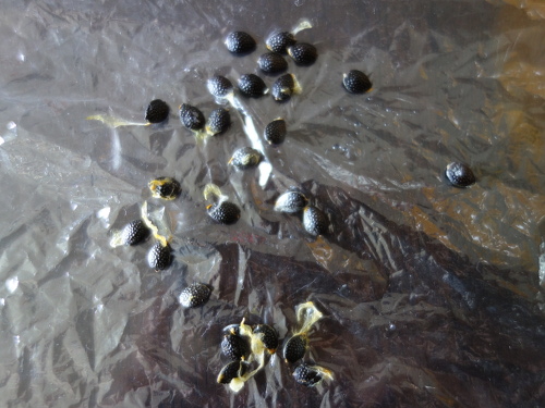 昨年蒔いた種から発芽して実を2016年夏に収穫した時の種27個です。これが発芽して育てば第二世代になります。4日間冷凍庫に入れていました。