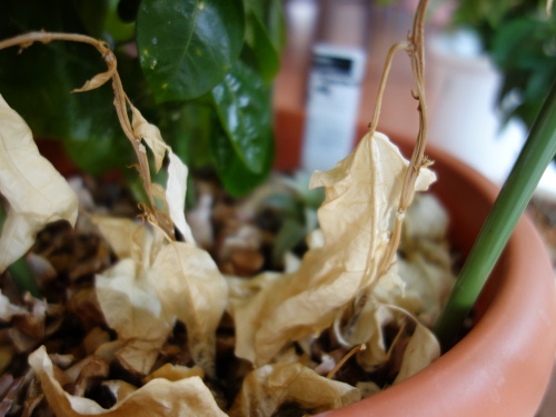 2016年の夏の失敗は、真夏に高温になったベランダに苗木を放置したことです。これにより、果実がまだ黄色いのに7月31日に最後の5個目も落果してしまったのです。花芽の生成も止まり、すでにあった蕾も落ちてしまいました。葉っぱもたくさん落ちて、残っている葉っぱも日焼けして部分的に枯れたりしました。緑の葉っぱが全体的に黄色っぽくなっていきました。秋になって新しい葉っぱは緑色になっています。秋になってやっと復活してきました。