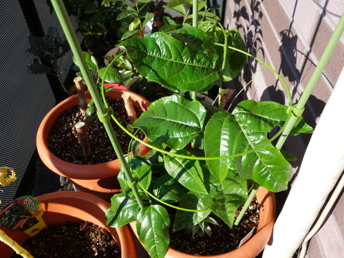 だいぶ蔓が伸びてきました。3本とも順調です。屈曲していた生長末端が元に戻りました。壁に接していた葉っぱは焼けてしまったので、ハサミで先端を切りました。