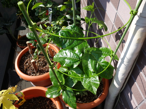 2015年8月に続々と発芽してきたパッションフルーツの実生苗は栽培を続けました。最初のたくさん出てきたスプラウトのうち、一部は地植えしましたが、2015年冬に全部枯れました。つまり、うちの気候では冬の霜や雪で枯れてしまうので、多年草としては生きられないということです。一方、スプラウトの中から良さそうな4本を選抜し、大きめの鉢に一緒に植えました。冬は室内に入れ、晴れた日の昼間はベランダに出しました。その結果、そのうちの1本(Aとします)は大きく育ち、4月24日には最初の花が咲きました。残りの3本のうち、最も育っていなかった1本は真夏に暑さで枯れてしまいましたが、残りの2本は夏の終わり頃から生長し始めました。最初に大きく育った1本(A)は最終的に7輪咲いて、そのうち5輪は受粉がうまくいったので結実して収穫できました(最初の1個は7月11日に落果し、最後の1個は7月31日に落果しました)。つまり、2015年の夏に種を蒔いて、2016年の夏に収穫できたことになります。1年サイクルで「種まき→発芽→生長→開花→結実→収穫」ができたことになります。年単位の話ですので、事実上これが最短かつ最速のサイクルになります。花芽の生成は真夏の前に止まりました。パッションフルーツはイメージと違って猛暑に弱いからです。真夏以降、花は一度も見られませんでした。