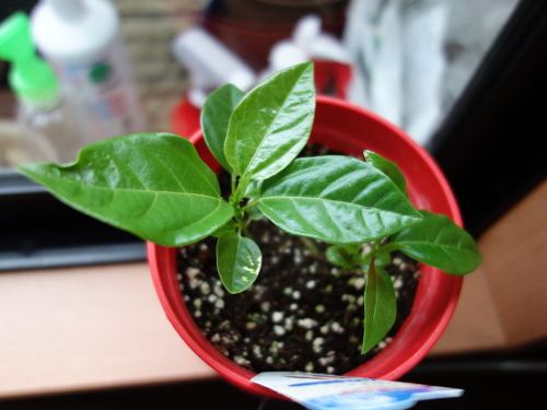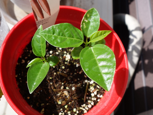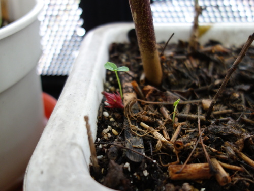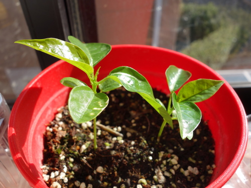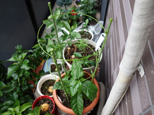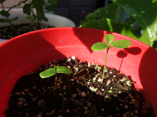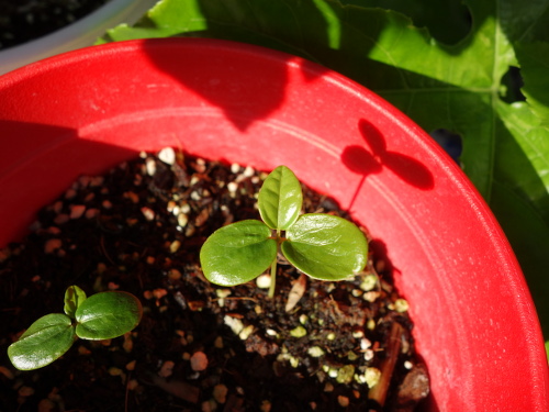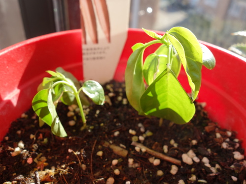 左側の2本が今年の種から発芽した実生苗2本。鉢が大きくなったので、もっと生長するでしょう。また、寒くなる日には部屋に移動しやすくなりました。