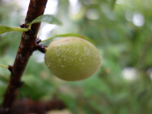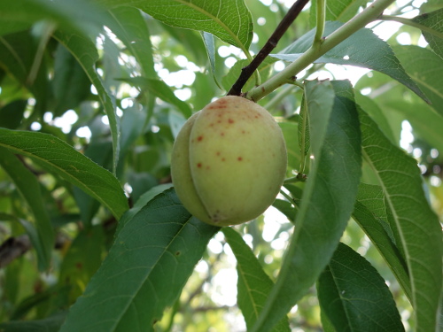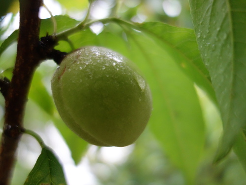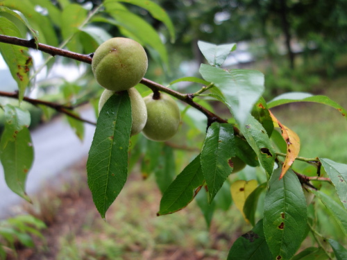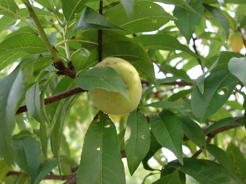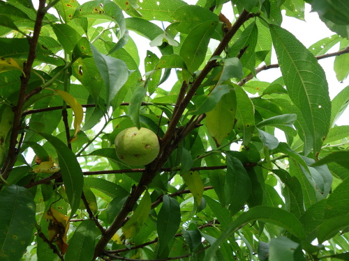 もう約10年になる白桃の実生に初めて実が生りました。収穫できるか、もしできたとしてどんな味がするか、興味津々です。突然変異していないでしょうか。