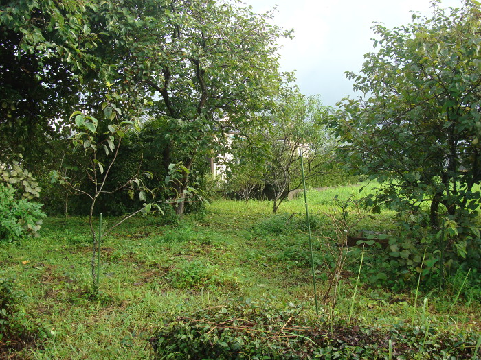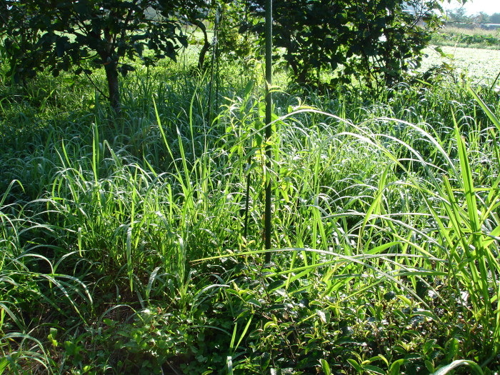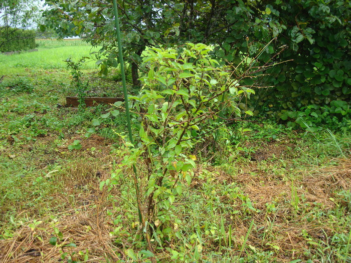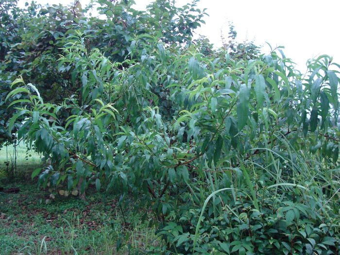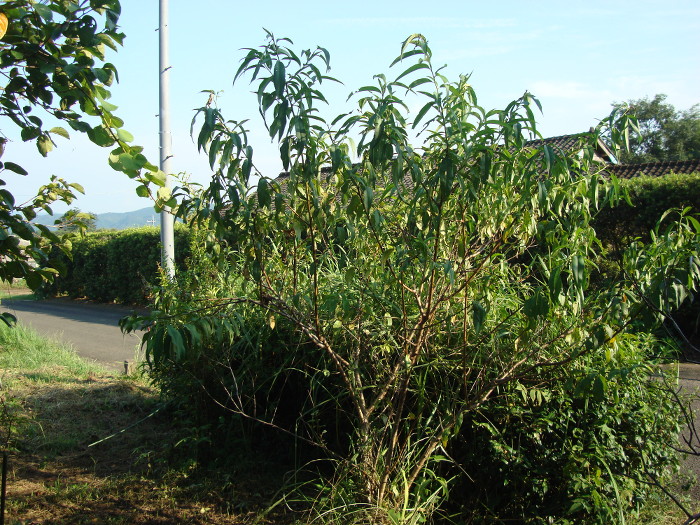 柑橘類(シークヮーサー)の苗木が2006年末からの冬の寒さに耐えきれず枯れてしまいました。その他の柑橘類(晩白柚や清見など)も何度かチャレンジしたのですが、やっぱりだめでした。我が家の畑では霜が強すぎて柑橘類は育たないと結論しました。そこで、そのシークヮーサーが植えてあった場所に、2007年の春に種から発芽した白桃の苗を移植しました。あらかじめ別の場所で発芽した白桃でしたが、発芽して1年未満の苗でした。移植して4ヶ月後の夏には下の写真のように生長していました。