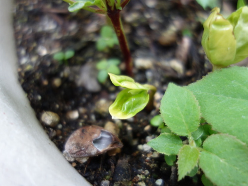 昨日、殻を人為的に少し剝いてはずそうとしました(左側)。まだはずれていません。