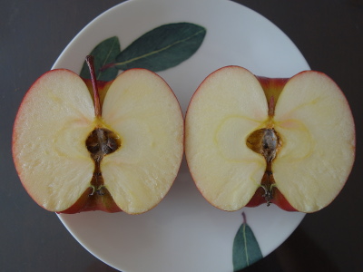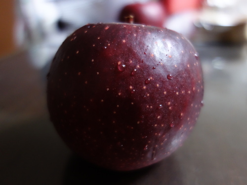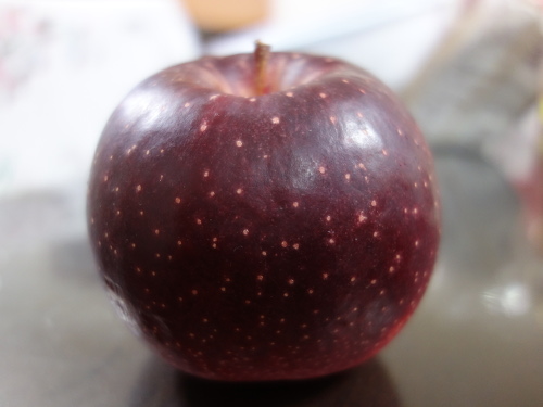 まず、色の濃い方を水洗いして包丁で半分に割ってみました。驚いたことに、中に赤みがかった箇所がありました。皮の近くも赤い色素のグラデーションが付いていました。こんなりんごは初めてです。まずは見た目で気に入ってしまいました。そしてかじってみると、とても柔らかく食べやすいです。歯の弱い人でも食べられる感じです。甘さも酸味もほどよい感じでした。半分はラップをして冷蔵庫に入れました。明日食べます。もう1個(黒っぽくない赤い方)は明日の夜かあさっての夜に食べることになりそうです。