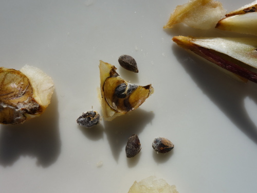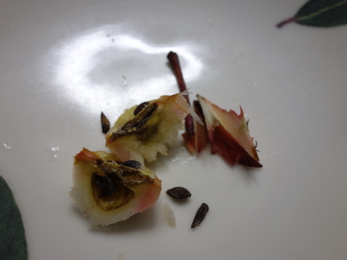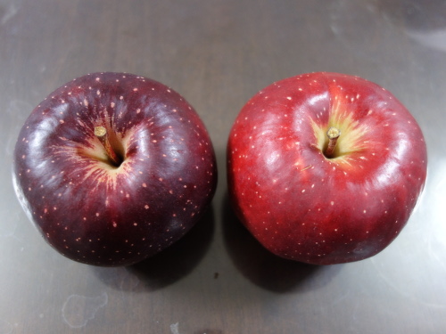 2016年11月10日に近所のスーパーストアダイノブからレッドゴールドという青森産のりんごを買ってきました。レッドゴールドはゴールデンデリシャスとリチャードデリシャスをかけてあるりんごであるという説明書きが商品のところにありました。黒っぽい方は蜜が入っていて、赤っぽい果実の方は蜜が少なく、果肉は軽く柔らかいとの店のレビューが貼ってありました。そこで、赤っぽいのを1個と黒っぽいのを1個買ってきました。食べ比べてみるために見た目が大きく異なるのを2個買ってきました。以下に結果を示します。種は蒔くことにします。親と同じものは生らないし、せいぜい発芽の確認までで終わりそうですが、育つものなら育ててみたいと思わせるりんごです。