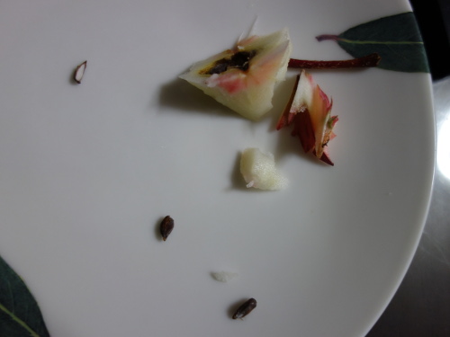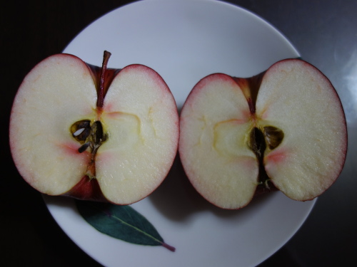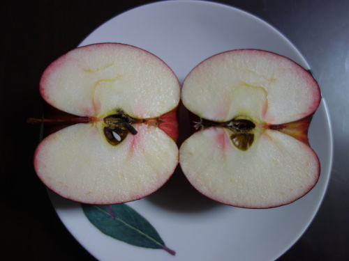 何と種の付近も赤いです(芯の上下)。こんなりんごには初めて出会いした。蜜は入っていませんでした。