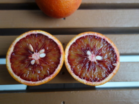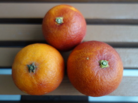 道の駅でレッドオレンジというみかんが売っていました。初めて見たので買ってみました。3個で120円でした。レッドオレンジは、シチリアなどが原産の果肉が赤い色をした柑橘類です。赤い色が全体に均一に存在しているわけではなく、剝いた印象では、皮の付近に局在化しているようです。その色素の成分はアントシアニンです。ると独特の味は、シチリアのような温暖な気候の土地では日中と夜間の大きな気温の差によってアントシアニンの合成が刺激されるためといわれています。私が食べてみた感想は、味がネーブルに似ているということです。果肉が赤いので、食欲をそそります。珍しいですが、健康によい成分を含むので、一度は食べてみたいですね。種は蒔いてみました。芽が出たら育ててみます。