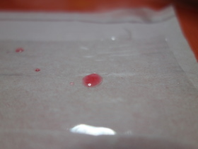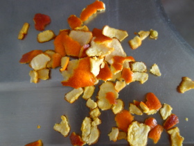 手で外果皮(フラベド)を剥くと、は、じょうのう(砂じょうを包む内袋)から色素が滲み出してきて、中果皮(アルベド)が染まりました。