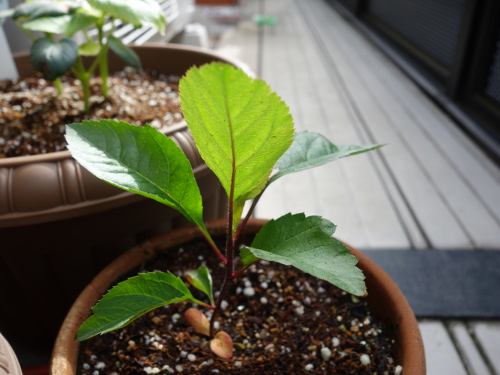 この陶器製の鉢にグァバの実生を植えて、プラスチック製の鉢の場合と比較したいと考えました。そこで、このサンジョナゴールドの実生をプランターに移植することにしました。ただし、鉢の土を丸ごと使用します。これなら枯れないのではないかと推測されます。