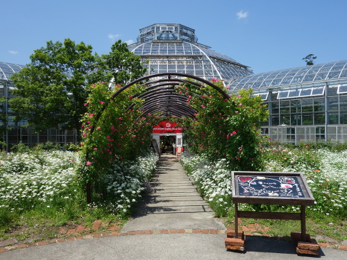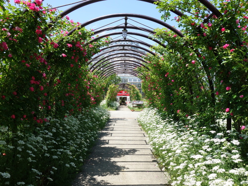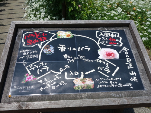 通路の中ほどで一回トンネルがなくなりました。外にはオルレアの花が一面に咲いていました。もう少し進めば薔薇ドーム入り口です。バラドーム案内板があります。
