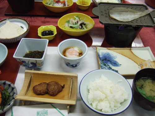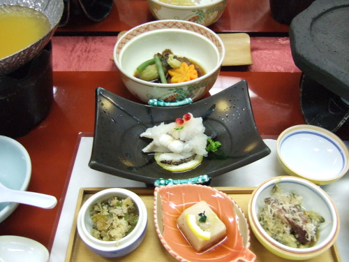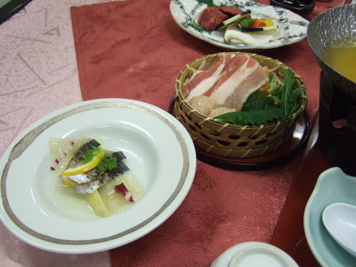 夕食の料理。部屋で食べるのではなく、レストラン・宴会場のあるフロアーまで移動して、そこの用意されていたのを食べました。(19:06)