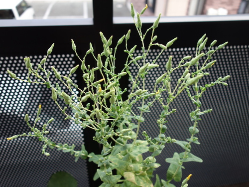 4月に間引きした1本(鉢から引っこ抜いたもの)です。間引きした当初は葉っぱだけ収穫して捨てようと思っていたのですが、ダメ元で大きなプランターに植えていました。その結果、こんなに成長しました。捨てずに育ててみるものですね。このまま成長すれば種がとれて第五世代の栽培ができそうです。
