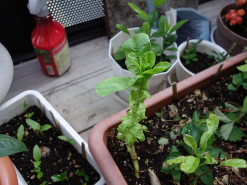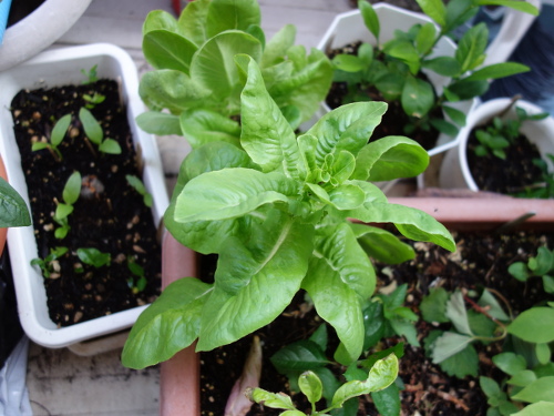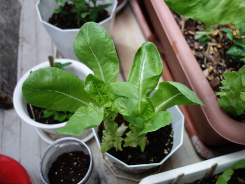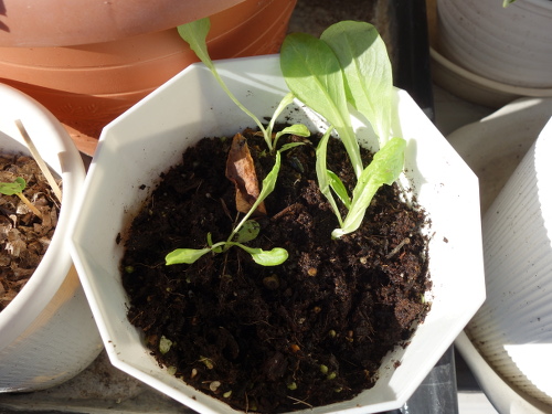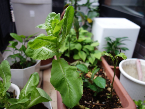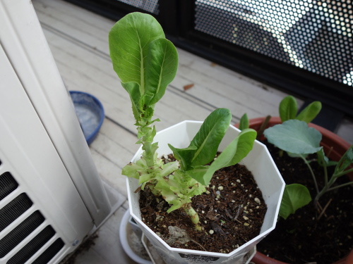 サラダ菜第三世代の種がプランターに落ちて、そこから発芽しました。鉢に植え替えて栽培しています。その生長記録です。