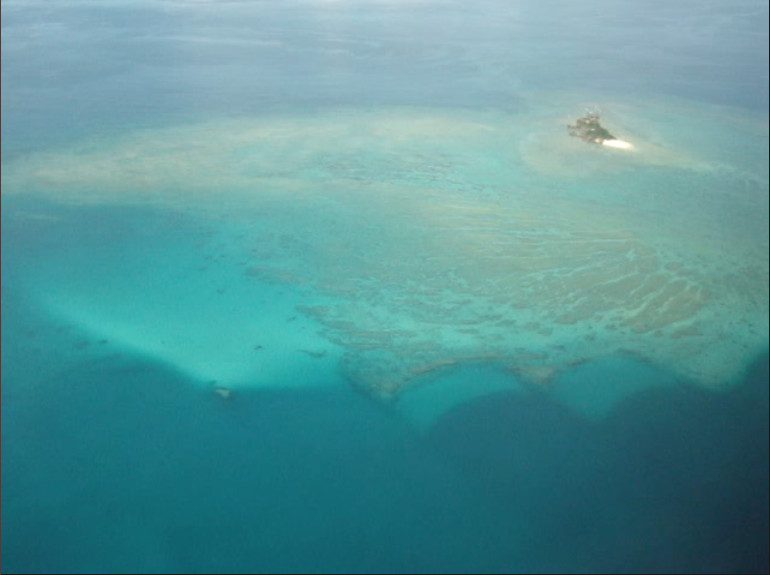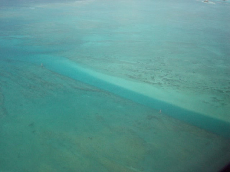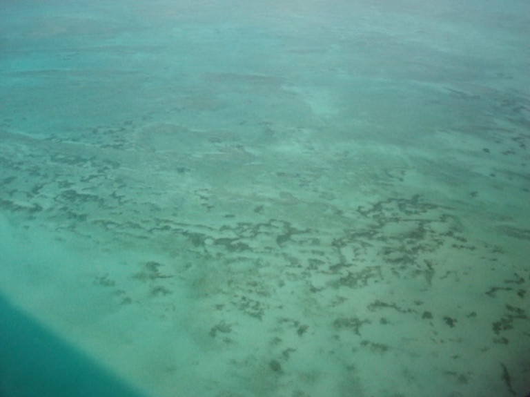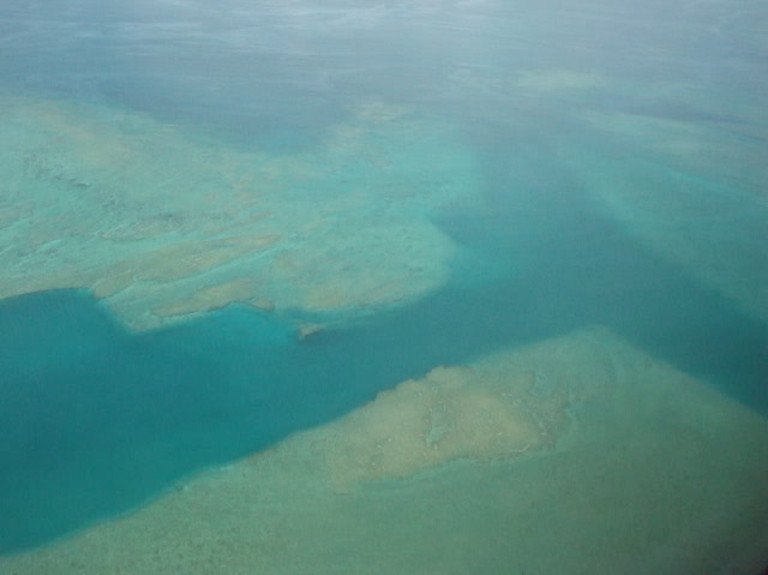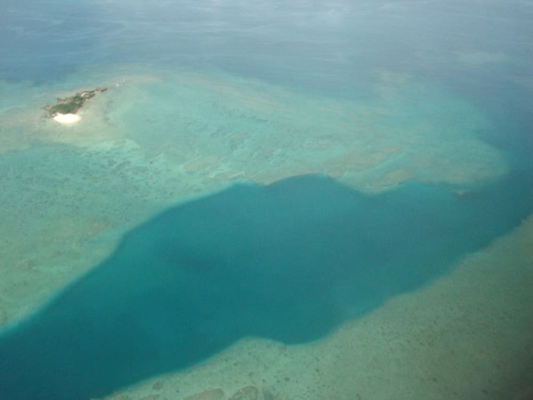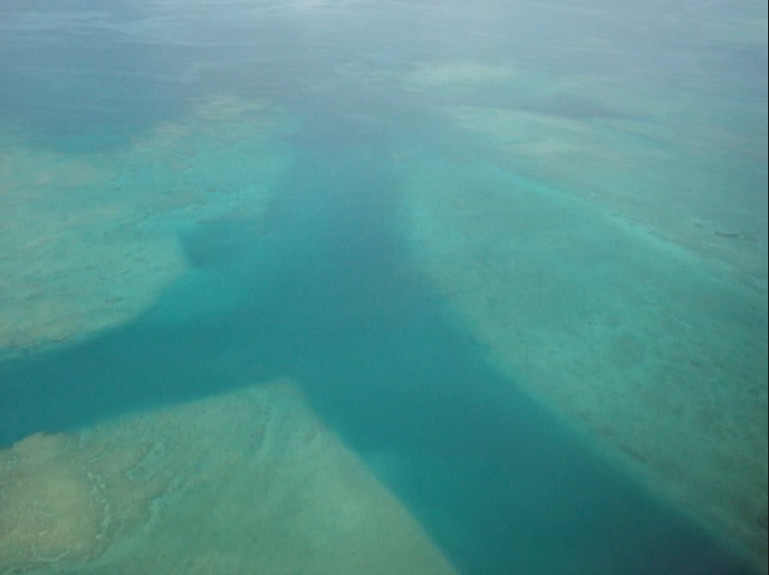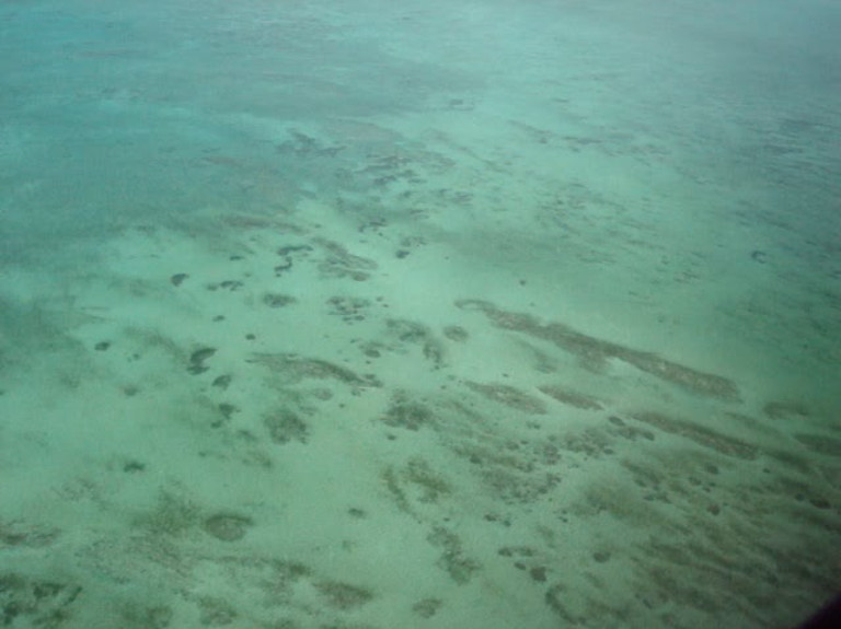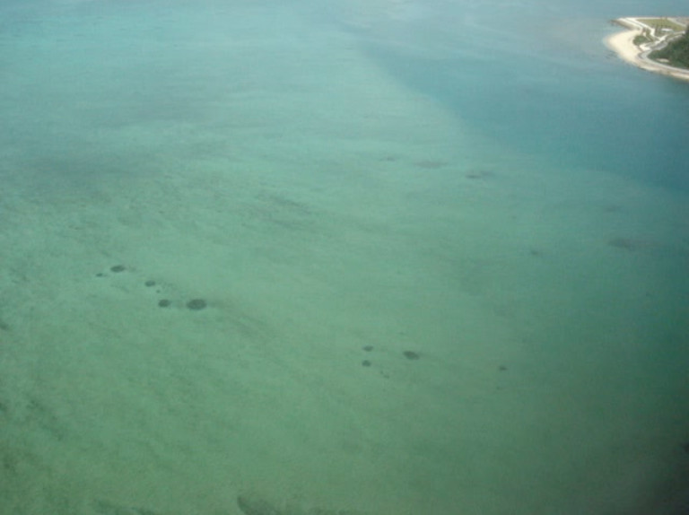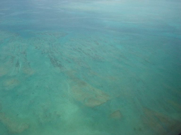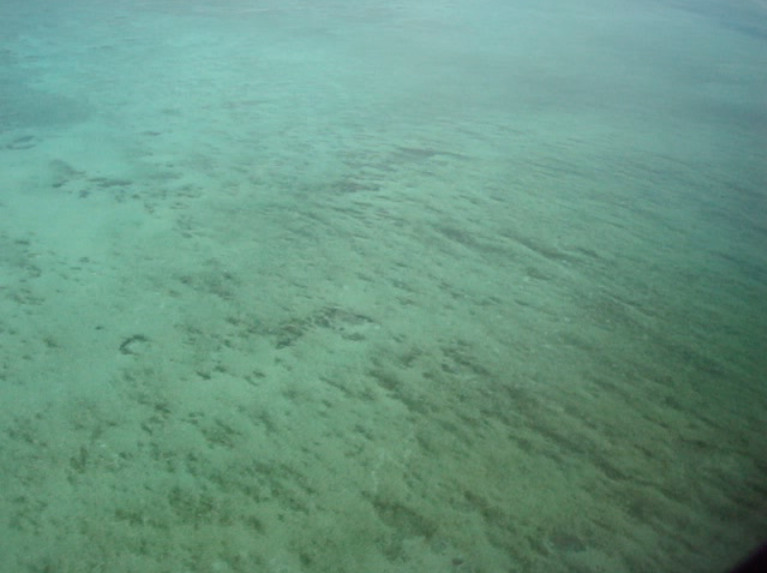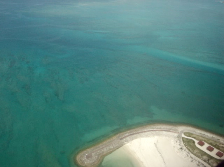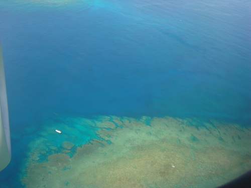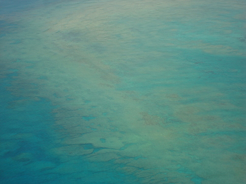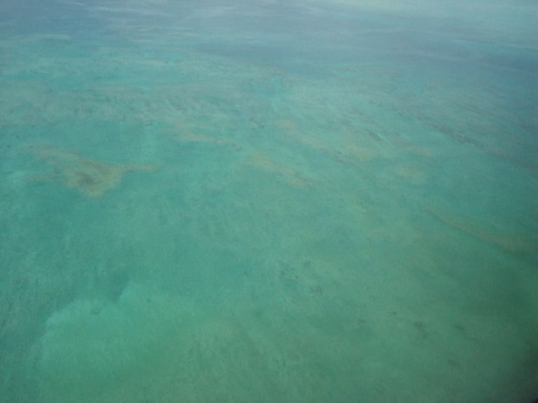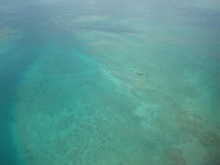 トップページ > 私の旅行記 > 沖縄旅行記 > 沖縄旅行2014-1日目 > 那覇空港に着陸直前のエメラルドグリーンの海