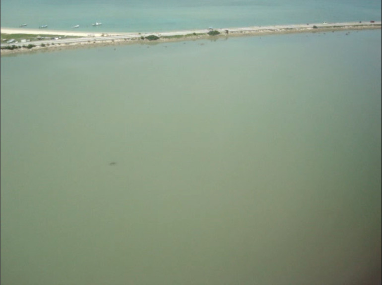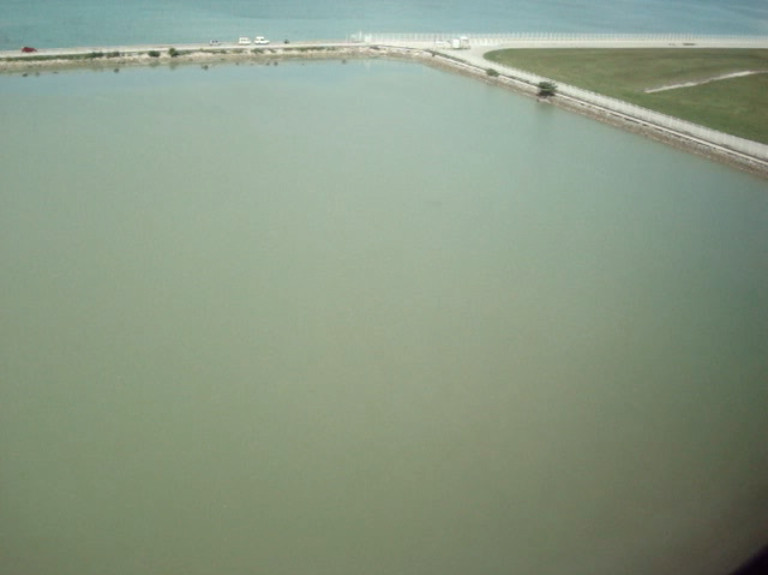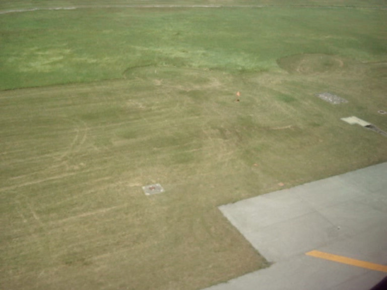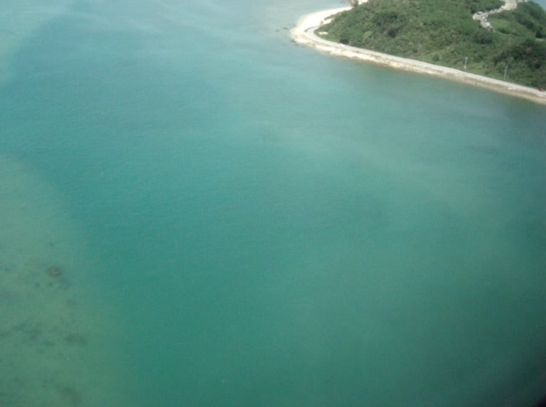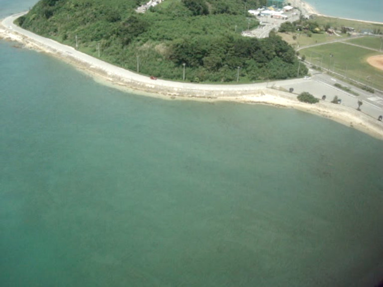 着陸するまでの3分未満の海の色を撮影しました。沖の方の深いところは濃い青色ですが、浅い所はエメラルドグリーンで、沖縄に来た感じがします。また、沖の方は透明な海水ですが、滑走路の近くの陸に近いところでは水が濁っていました。