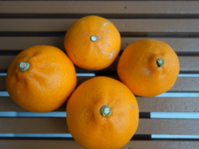 4個並べてみました。4個とも温州みかんよりは大きいです。デコポンや不知火によく似ています。