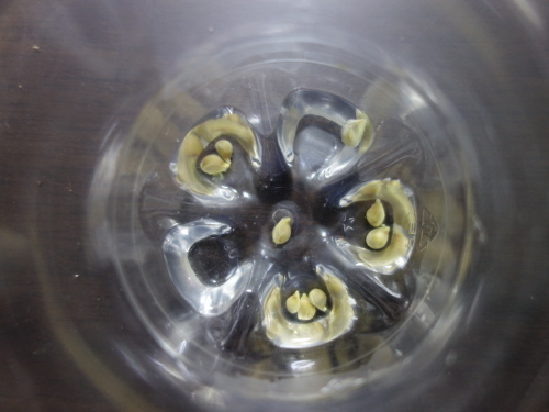 種は8個入っていました。切断したPETボトルに入れて、水も少量入れて撮影。8個は田ノ浦で買ったシークヮーサーの種(写真右上)より若干小さかったです。