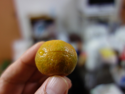 2016年7月にホームセンターから買ってきた接ぎ木苗は無事に生長して、実が13個あった実が6残りました。そのうちの1個を収穫して、包丁で切り目を入れて絞ってみました。焼いた塩鮭にかけてみましたが、適度に酸っぱくて美味しかったです。あと5個生っているので、随時、収穫して焼き魚の調味料として利用していこうと思います。そのまま食べるのはあまり美味しくないからです。どうしても温州みかんと比べてしまいますが・・・。