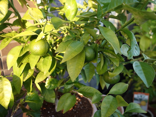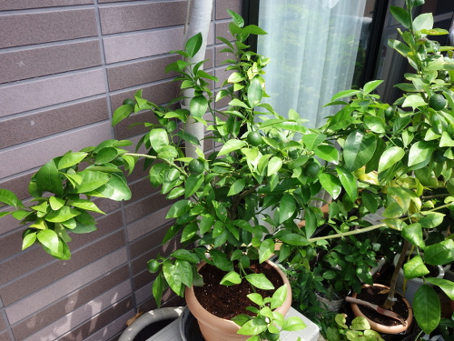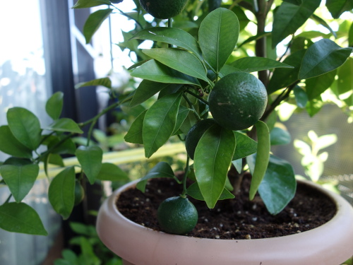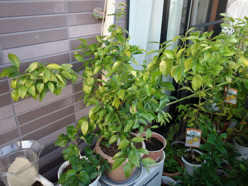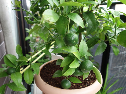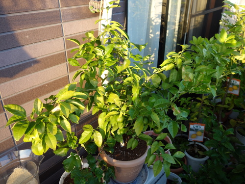 2016年7月にホームセンターで購入したシークヮーサーの接木苗には購入時に13個の実が生っていました。鉢植えでベランダで育てました。2017年には2月末まで実を生らせていたせいか、その年の春に花が咲きませんでした。しかし、購入から1年半経った翌年(2018年4月)には花がたくさん咲きました。花後には70個ぐらい結実していましたが、徐々に生理落果して半年後の9月には25個に減少しました。この25個が2018年の事実上の収量です。結実した個数を70個として、それから生理落果して残ったのが25個なので、結実個数を100%として算出した収率は約35%です。買ってきてから満2年で青切りシークヮーサーが25個収穫できたとなれば、木の負担も考慮するとまあまあの結果ではないでしょうか。これまでのプロセスを以下に示します。