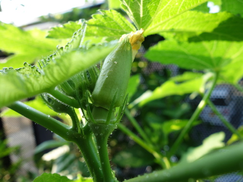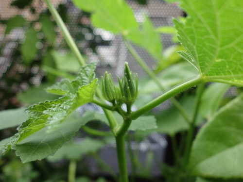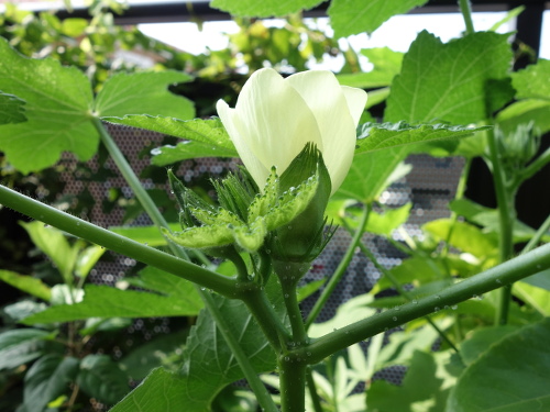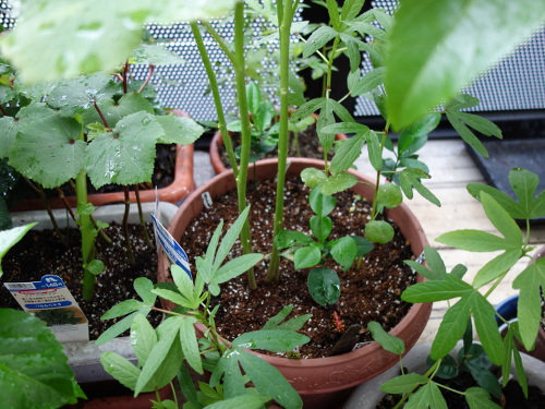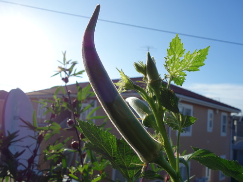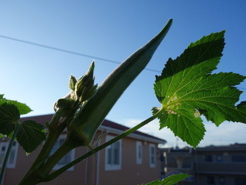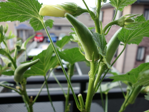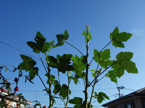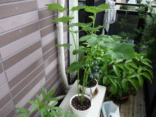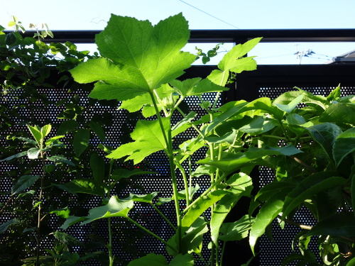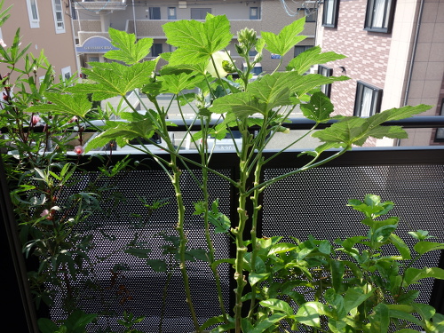 2016年7月27日に最初の花も咲いて、綿棒で授粉してやったら結実して生長しています。今ではパッションフルーツの蔓のあんどん仕立ての高さも越えて、ベランダで最も丈の高い植物になっています。苗が4本1ポットでしたが、間引きをせずに4本全部育てています。一般には1本残して、残りは根元から切るそうです(根を分けることはうまくいきません)。でも、4本ともグングン育っています。このまま4本でいきます。心配なのは水の消費量がかなり多いことです。毎日最低2リットルはやっています。しかし、鉢の底から水は出てきません。猛暑のベランダでこれだけ大きくなった島オクラの木が1個の鉢に4本も植えてあるのだから当然と言えます。