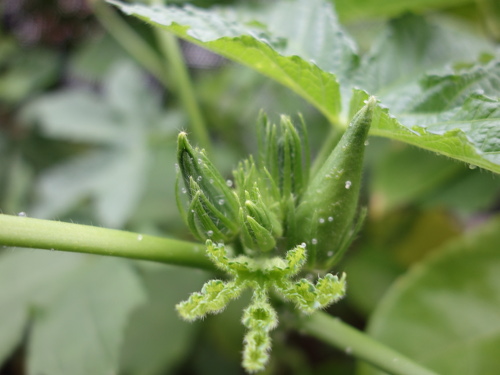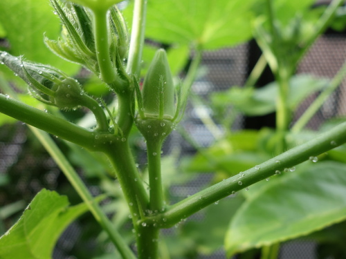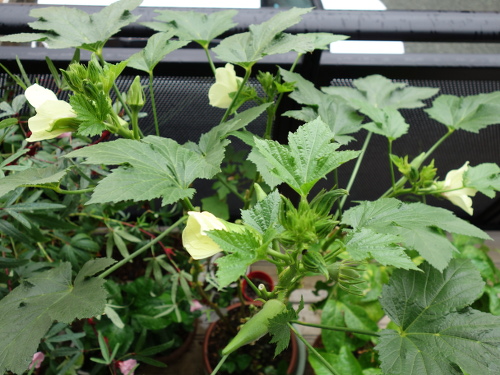 島オクラが3種類(ジャンボオクラ(左下)、赤オクラ(右下)、島オクラ)の中で最も生長しています。