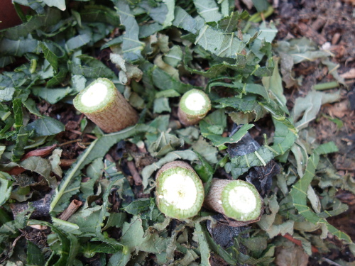 4本の切り株。昨年はもっと遅くまで栽培できたのですが、今年はいま一つでした。やはり4本より1本がいいと思われます。