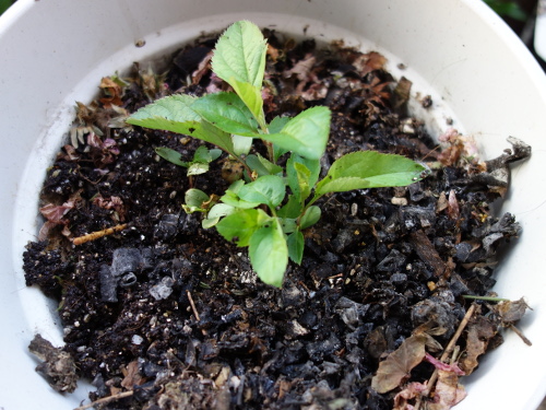 2016年4月19日、シナノレッドの実生苗がだいぶ本数も増えて育ってきていたところに、熊本地震の前震で鉢が落ちてしまいました。そこで、果物の皮やハイビスカスの花びらを集めた大きな鉢に植え替えました。これで生長具合を見てみます。シナノレッドの発芽率は悪くないようです。