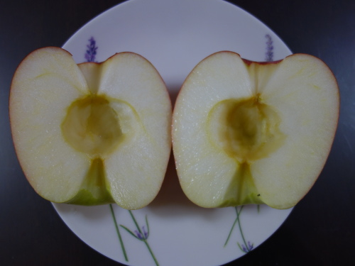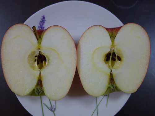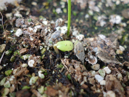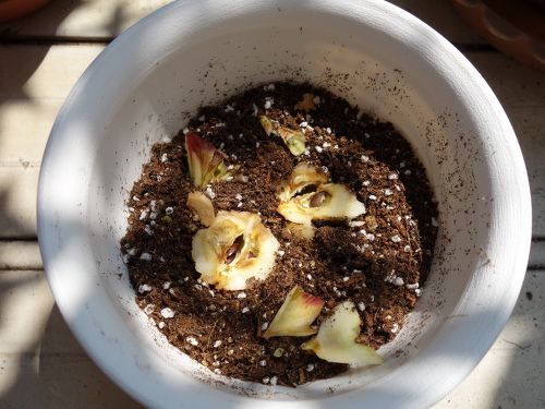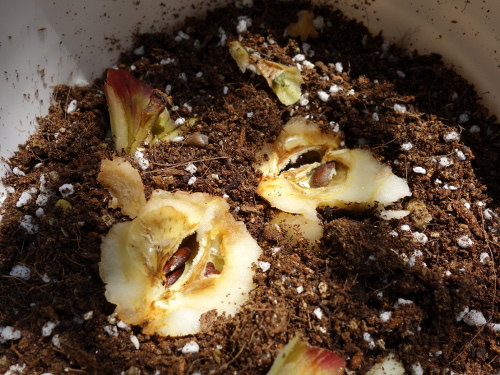 熊本地震の前震(とあとでわかったのですが)でエアコンの室外機から鉢が落ちてしまったので、バナナの皮などを貯めた鉢に植え替えました。食べてみたところ、甘くて、食感もいわゆるごく普通のリンゴと言う感じでした。冷却することなく鉢の土の中に埋めました。発芽するとしたら冬を越したあとと思っていたのですが、12月29日現在で2本目が出てきました。しかし、結局枯れてしまって1本になりました。